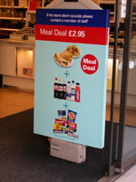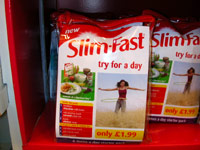 ダイエット連載終了から早4か月。「今の杜野みかんは果たして体型を維持しているのか、リバウンドはしていないのか。それともさらにスレンダーな体型を手に入れているのか」と、皆その後の報告を心待ちにしてくれていると思う(気のせい?)。 ダイエット連載終了後、ロサンゼルスとラスベガスに行った私は、その3か月後、今度はロンドンに行くことになった。旅行中というのは、何かと開放的な気持ちになるもので、特に食事は、旅行の楽しみのひとつでもある。ロサンゼルスには兄が住んでおり、外食ばかりということにはならず、しかも甥っ子と遊んでばかりいたので、太るどころか体重を減らすことに成功したが、ロンドンでは外食ばかりになることは行く前からわかっていた。 ダイエット塾の七尾先生からも、「ロンドンで太ってきたりしないように」ときつく言われていたので、かなり気を引き締め、私は生まれて初めてのヨーロッパ旅行を決行した。ロンドンには仕事関係の人ふたりと共に向かい、現地に住む知人の家にお世話になることになった。着いた日は、現地に住む人の家で焼肉をやった。そこでは高級なワインを振舞われ、4人ですぐに一本を空けた。同行した人と現地の人は、連日ゴルフざんまいで、私は毎日一人でロンドンの市内を歩き回り、ひたすら観光に励んだ。 私が市内を歩き回るもうひとつの目的は、「ロンドンのダイエット事情」を探ることにあった。日本にいると、アメリカのダイエット情報は入ってくるが、ヨーロッパのダイエット事情はあまりわからない。アメリカ人には肥満の人が多く、その肥満度たるや日本人の「デブ」という概念を大きく凌駕している。その分、フィットネスクラブやサプリメント、ダイエット食品なども充実している感があり、町を歩いていてもいたるところでサプリメントを売っている。 私はロンドンに到着してすぐに、現地にいる人に「ヨーロッパの人たちは、ダイエットに対してどんなイメージを持っているのか」ということを聞いたのだが、「あまり日本人やアメリカ人みたいに、ダイエットダイエットと騒いでいる感じはない」との答えだった。それでも太っている人は存在するだろうし、「太っている」ということが、見た目だけではなく、健康にも影響するものである以上、ダイエット方法がまったくないということはあり得ないだろう。「生涯ダイエッター」を標榜する私としては、ぜひともヨーロッパのダイエット法を知りたいところである。 ゴルフをする人たちと同じ時間に起きるので、朝は早く、大体8時から9時の間には外へ出る。初日は3時からミュージカル『マンマ・ミーア』を観て、夜は皆と合流して『オペラ座の怪人』を観ることになっていたので、朝の内に夜の劇場の場所を確認し、そこを出発点にさまざまなミュージアムを観て回った。10時くらいには商店が開き始めたので、町を歩く私はどこかに「DIET」という言葉はないか、「low calorie」という表示はないかと、必死になって探した。しかし、ないんである。 薬局やコスメなどを置いている店にも、サプリメントさえ置いていない。年に2回も海外旅行をしている(今年だけだけど)私だが、実は英語がまったく話せない。一人で歩いていてわからないことがあっても、「エクスキューズミー」「プリーズ」「サンキュー」の三つと、ボディランゲージのみですべて切り抜けている。だから、「ダイエットに関することは、どこへ行けばわかりますか」などとはもちろん尋ねられないし、「サプリメントが欲しいのですが」ということも、伝えられない。これは困ったと思っている時に目に入ったのが、コスメを売っているお店の前に出ていた「Meal Deal」と書かれた看板である(※写真A)。 何でコスメを売っているところに、パンや飲み物、スナック菓子の看板が出ているのだろうかと不思議に思い、私は思い切ってその店に入ってみた。すると地下に続く階段があり、下りてすぐのところに「Slim Fast」と書かれた商品が置かれていたのだ! これぞ私が求めていたものに違いないと、早速手にすると、英語で説明されているのできちんと理解できたわけではないが、どうやら6日分の食事メニューが入っている「ダイエット食品」のようだった(※写真B)。 しかし、それにしては値段が安い。1ポンドは200円(2003年7月当時)だから、1.99ポンドといえば約400円くらいだ。日本の場合、痩せるお茶やダイエット用の食品やサプリメントはとても高い。時々安いものもあるが、それでも6食分が400円などということはあり得ない。ロンドンは、世界でも1、2を争うほど物価が高い町である。私が行った時期はバーゲン期間だったにも関わらず、私はその値段の高さにかなり驚かされた。 にも関わらず、この安さはどうだろう。やっと見つけたと思った「ダイエット関連」の商品だったが、その店には他にダイエットに関するものは置いてないようで、薬類やティッシュ、シャンプーなどもあるの